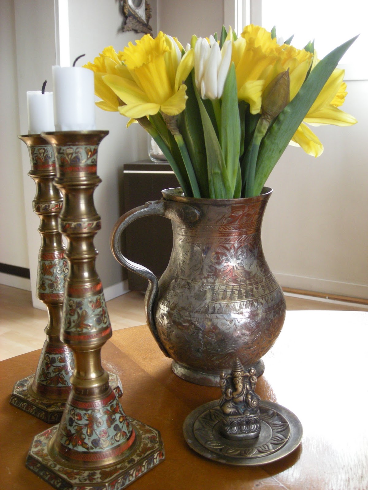 På mitt soffbord står just nu en samling i väldigt oädla metaller, en rökelsehållare köpt på Indiska för många år sen, några lusstakar som jag tror farmor kan ha köpt i Marocko och så en vas med handtag, fyndad på loppis för en tia.